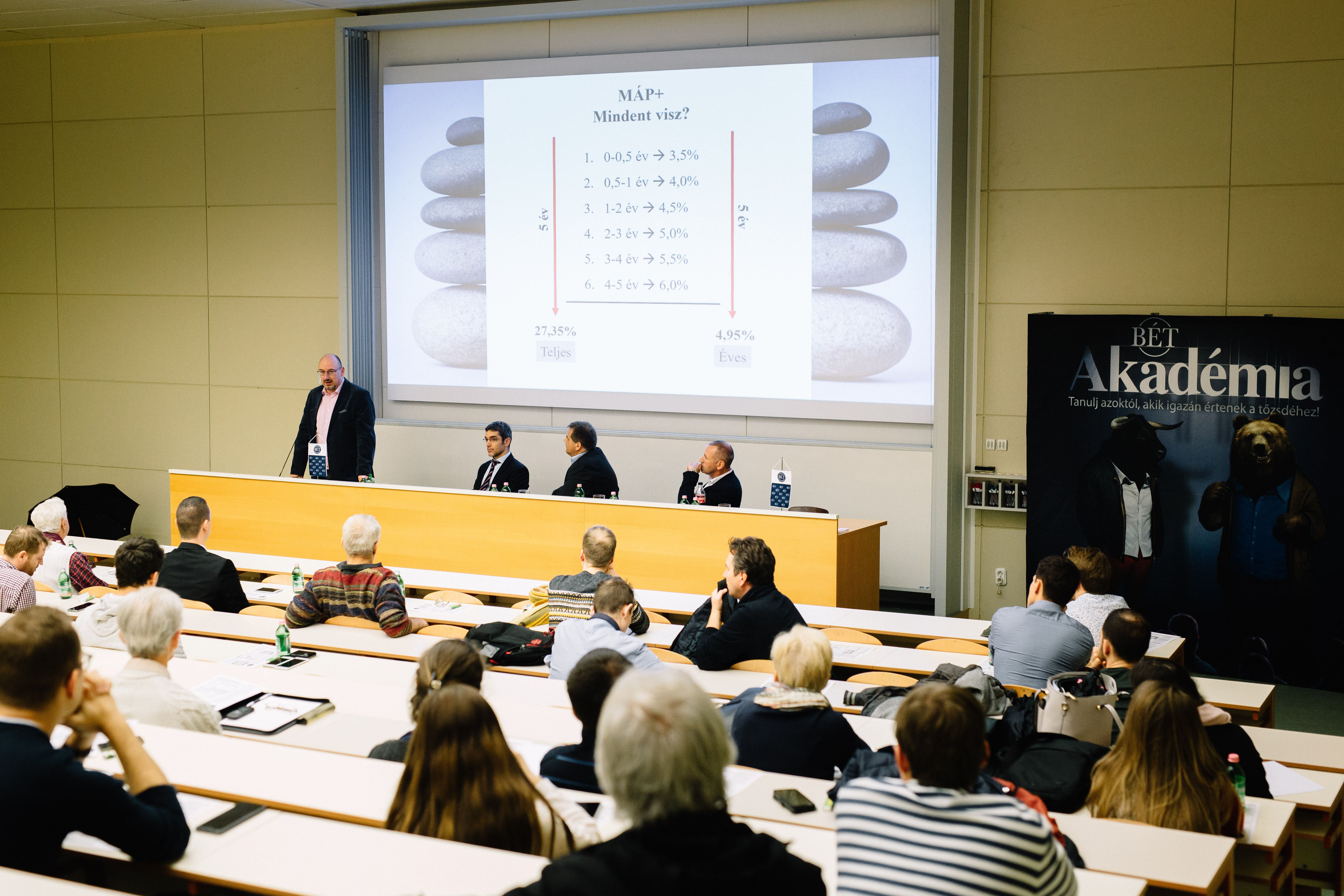 Az első előadáson Virág Ferenc, a Random Capital tanácsadója és tulajdonosa a befektetések világába nyújtott betekintést, a befektetési piac aktuális lehetőségeitől kezdve az aktív és passzív befektetési stratégiákon át a kockázat-hozam-időtáv összefüggésig. Ezt követően Miró József, az Erste Befektetési Zrt. vezető elemzője és részvénystratégája a megtakarítások természetét mutatta be, különös tekintettel a forint és deviza alapú takarékoskodás előnyeire és hátrányaira. Előadásában ezen felül érintette többek között az árfolyamkockázat, a reálhozam és az infláció témakörét is. A nap harmadik, egyben utolsó előadása Vitkovics Péter, a Megakrán Nyrt. felügyelőbizottságának elnökének nevéhez fűződött, aki a BÉT Xtend piacával kapcsolatos tapasztalatait osztotta meg a publikummal. A rendezvényt Q&A blokk és kötetlen beszélgetés zárta.